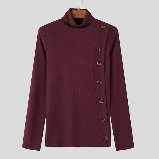Stretch Slim Fit Bottoming T Shirts Mens Spring Trendy Irregular Button Design T-shirts Fashion Solid Color Men Turtleneck Tees
