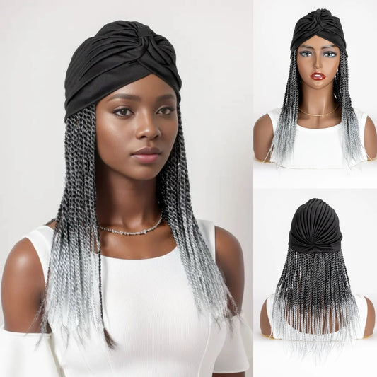 WIGERA Medium Ombre Black Gray Headband Twist Braided Synthetic Wig With Turban Braiding Hair Extensions Head Scarf For Women